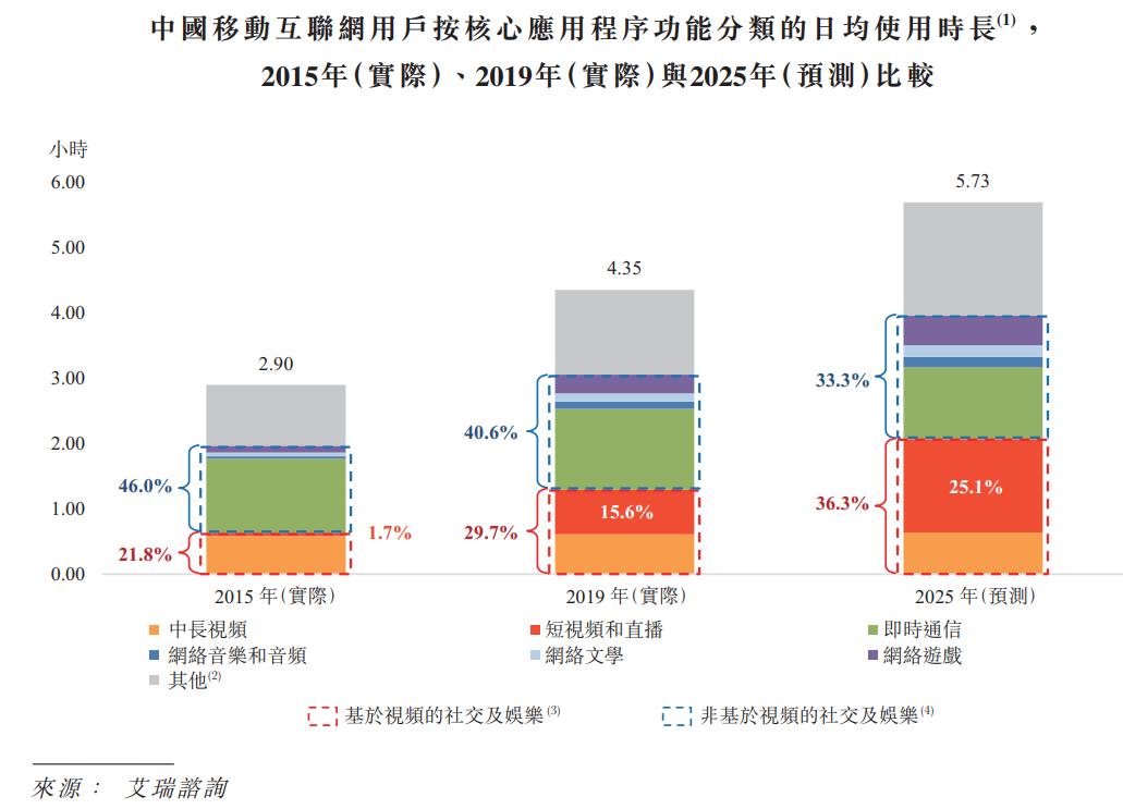 同样来自艾瑞的付费报告,2025年短视频的用户时长仍然会高速成长,有望成为全网时长最大的单一领域,超过了即时通讯。