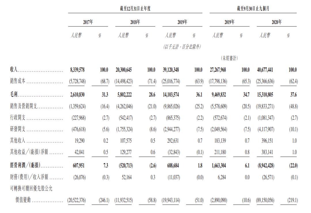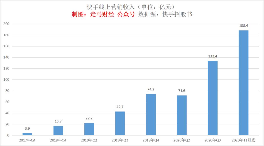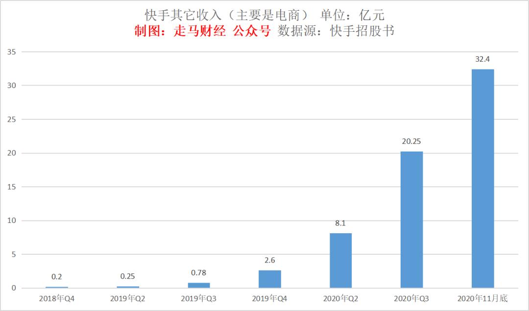 电商业务收入构成了快手其它收入板块的主体,这一板块随着电商GMV规模的极速膨胀而水涨船高。2019年,相对于GMV的600倍增长,该板块营收增长13倍,2020年前三季度同比增长大约25倍。19年营收增速远低于GMV增速是因为18年8月才开展电商,GMV基数实在太低了,而其它收入里还包括游戏分发等业务,同时19年时快手电商货币化率还有限,20年营收增速远超GMV增速,主要是因为快手电商的货币化率有所提升。