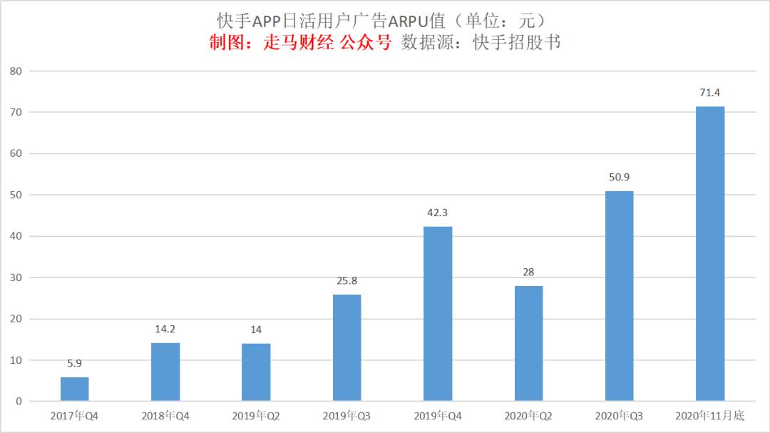 广告ARPU值是指单用户自然年内广告价值,用广告营销收入除以日活就能得出这一结果。从上图可以看出,快手的日活用户ARPU值正处于高速上升通道,2018年全年增长140.7%,2019年增长197.9%,2020年前三季度接近100%。