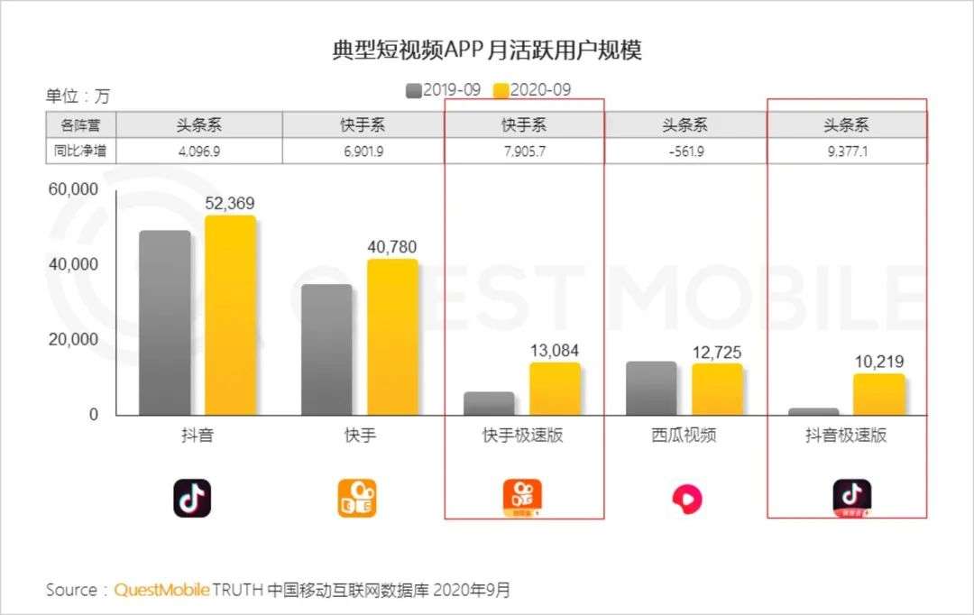 从QuestMobile的数据来看,抖音日活在2020年也没什么明显的增长。6亿日活的数据更多来自于抖音极速版、抖音火山版等应用的不去重增量。