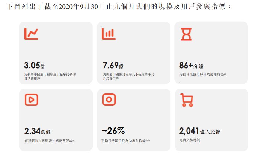 根据1月15日的最新版招股书,截至2020年9月30日,快手旗下主应用+极速版+小程序的去重平均日活是3.05亿,月活数据是7.69亿。快手主应用的平均日活是2.62亿,月活是4.83亿。快手极速版的日活在2020年8月突破1亿,小程序的日活未知。如果不去重的话,快手系日活应该是4亿左右了。