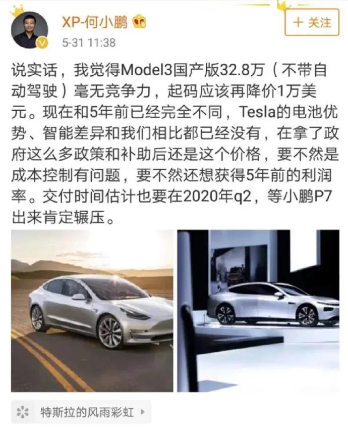 从2019年3月,何小鹏首次在微博上透露小鹏P7车型规划以来,“鹏友”们就惊喜的发现,不管是产品定位、智能级别还是整车造型的既视感……小鹏P7都明确把特斯拉Model 3作为自己的竞争对手,而且是唯一的对手。以至于Model3在发布国产版价格第一时间,何小鹏就在微博秒回“Model3国产版32.8万(不带自动驾驶)毫无竞争力,起码应该再降价1万美元.....并称交付时间估计也要在2020年的第二季度,小鹏P7出来肯定辗压。”