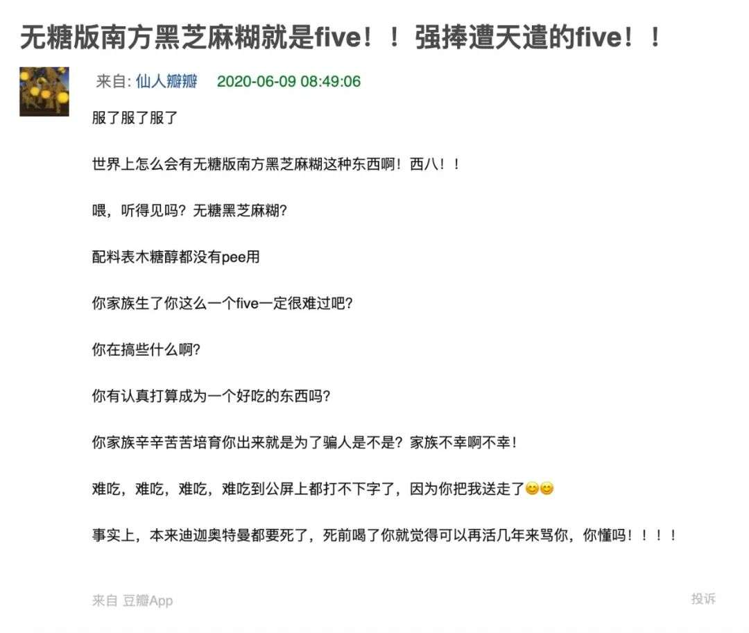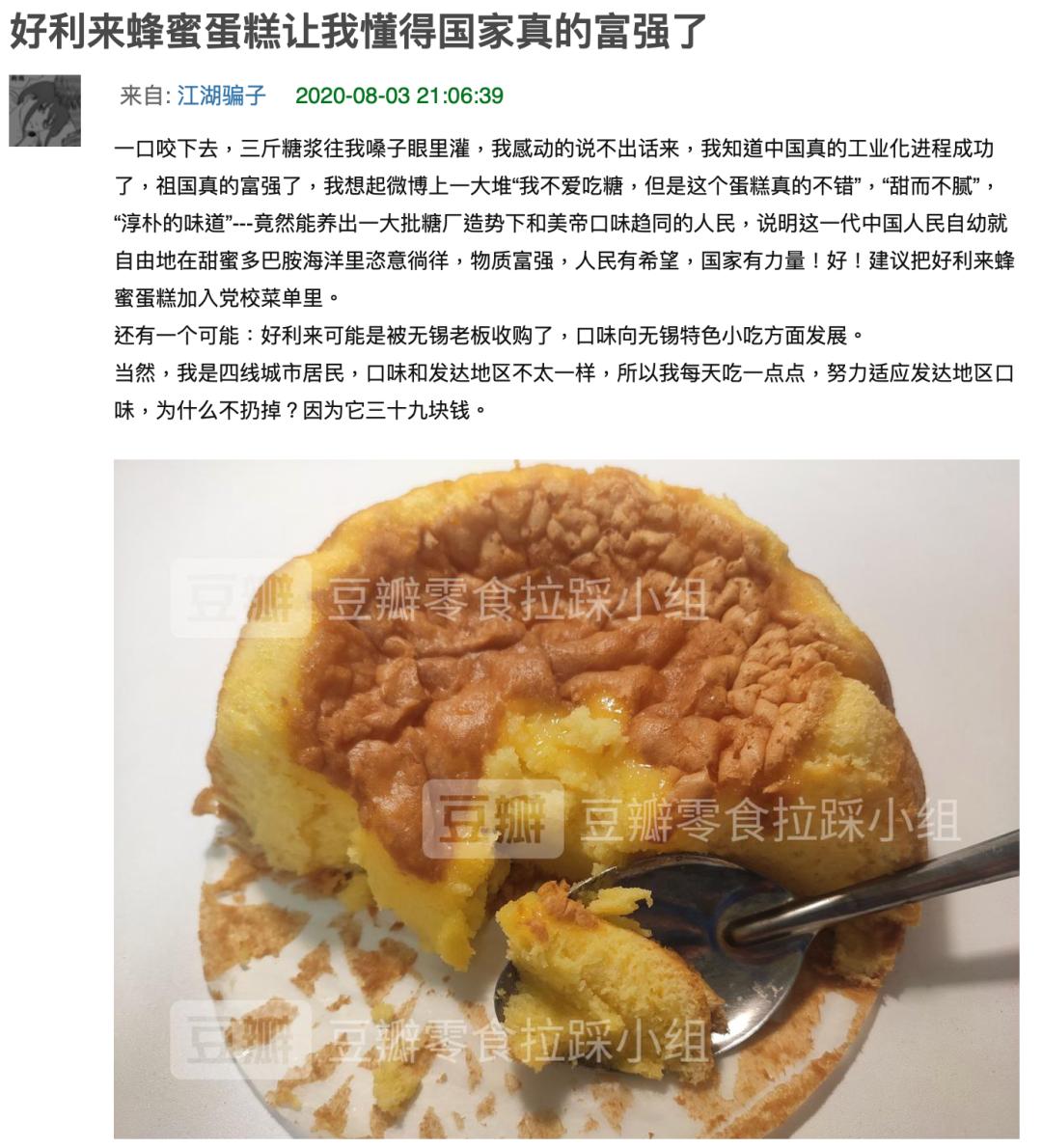 这位名为"江湖骗子"的豆友,用凝练大气(阴阳怪气)的文笔,从一款蜂蜜蛋糕甜度的细小切口上升到了家国情怀这样宏大的叙事框架,充分展示了自己和人民利益站在一起的高尚觉悟。最后这位朋友还用一种戏谑且自嘲的手法,给雄文画上了一个凄清却充满时代特征的句号。