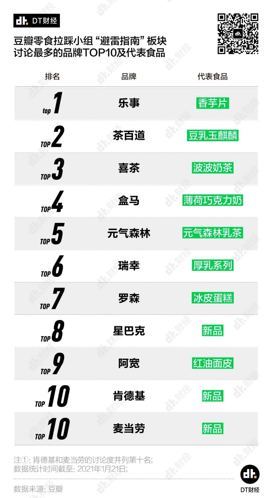 避雷指南区被提到最多次的TOP5黑红选手分别是乐事、茶百道、喜茶、盒马和元气森林。但请你注意,这里只是说这些品牌最容易陷入关于“好不好吃”的激烈讨论,并不是说这些品牌的产品最该避开。
