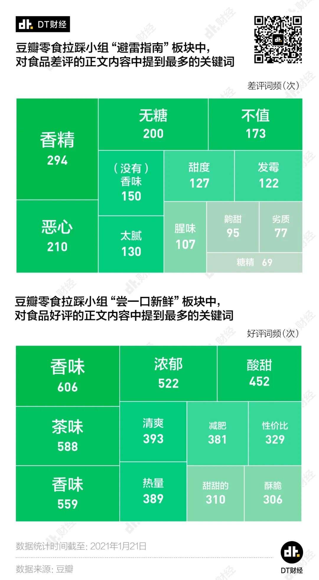 首先,可以看到判断一个食品好不好吃,香味和甜度是两大重要指标。不管是讨论避雷还是尝鲜,大家都频繁地提到这两个关键词。
