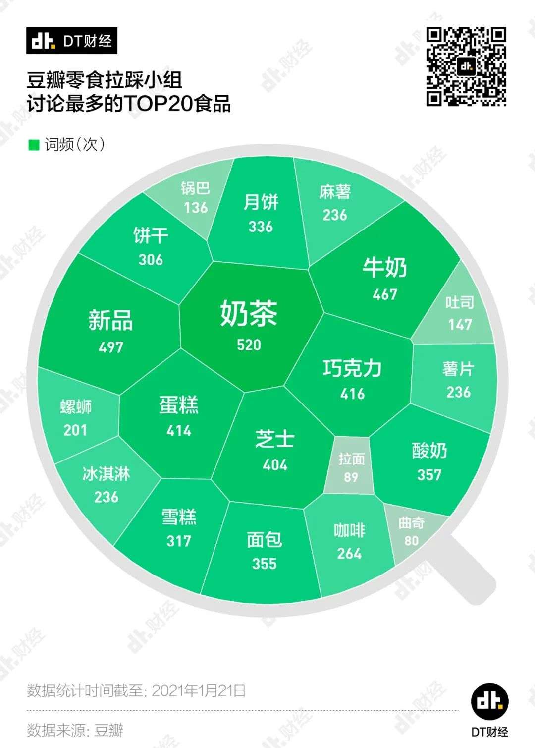 统计了所有板块总共19000多条帖子后我们发现,大家讨论最多的食品第一名是奶茶、其次是新品,另外就是各种碳水炸弹。