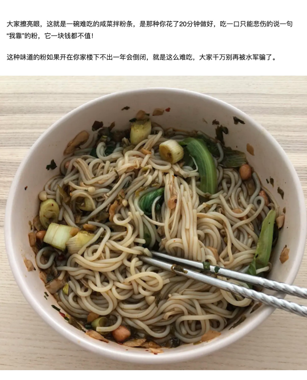然而,按照食用指南一番操作后,吃下这碗拌粉的一瞬间,失望和空虚从舌尖蔓延至全身,并在马迪的大脑皮层轰出了“就这”的两个巨型字体和一个大大的问号。