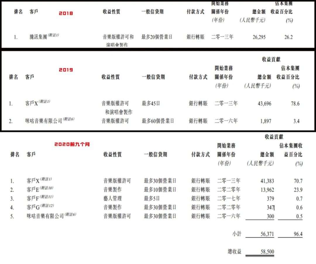 2019财年及2020年的9个月时间里,“客户X”分别付款0.44亿、0.41亿,产生收益分别占公司总收益的约78.6%及70.7%。根据附注对该客户的描写,可以确定“客户X”就是腾讯音乐娱乐集团。