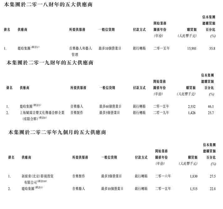 招股书显示,公司过去的所有五大供应商中,支付给鹿晗集团的总采购成本分别占风华秋实于2018财年、2019财年及2020年9个月的总采购成本约35.8%、46.1%及22.8%。