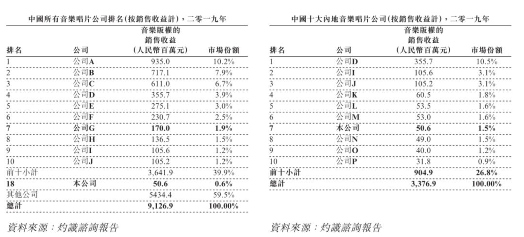 基于此,风华秋实也得以进入内地音乐唱片公司头部之列。招股书显示,按2019年中国音乐版权许可及音乐录制产生的收益来计算,风华秋实在中国所有音乐唱片公司中排名第18位,市场份额约为0.6%;在总部位于中国的内地音乐唱片公司中,排名第7位,市场份额约为1.5%。