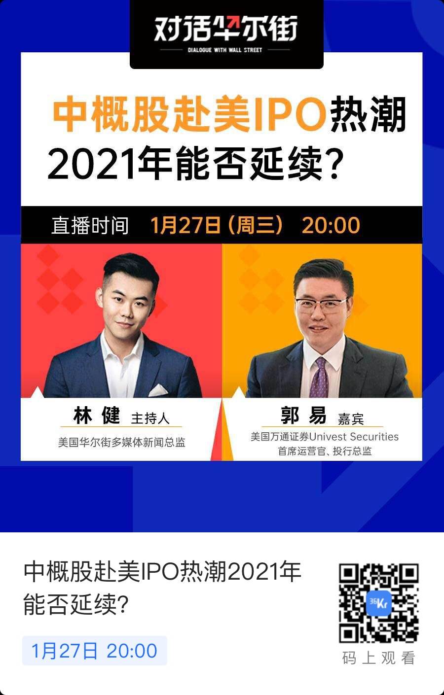 1月27日(周三)晚八点,常驻华尔街财经主持人林健将和美国万通证券首席运营官、投行总监郭易一起聊聊【中概股赴美IPO热潮2021年能否延续?】