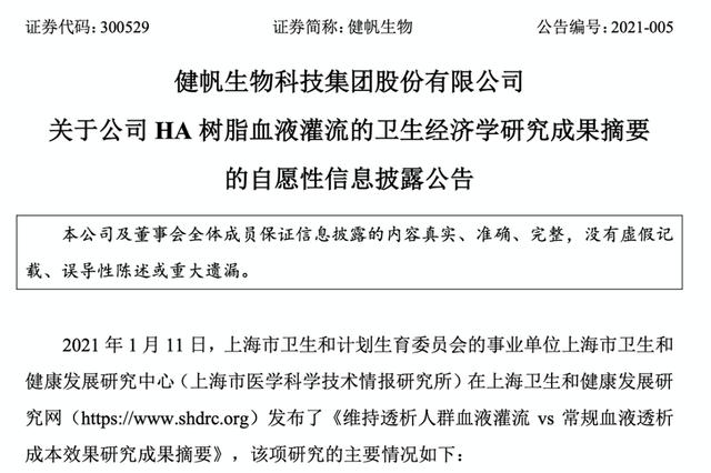 1月11日,血液灌流龙头——健帆生物发布了一篇《关于公司HA树脂血液灌流的卫生经济学研究成果摘要的自愿性信息披露公告》。