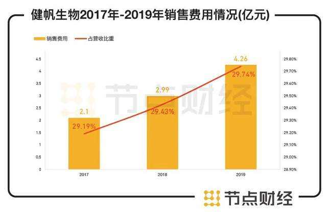 销量增长的背后,是销售费用的水涨船高。在2017年、2018年和2019年,健帆生物销售费用分别为2.10亿元、2.99亿元和4.26亿元,占营业收入的比重分别为29.19%、29.43%和29.74%。