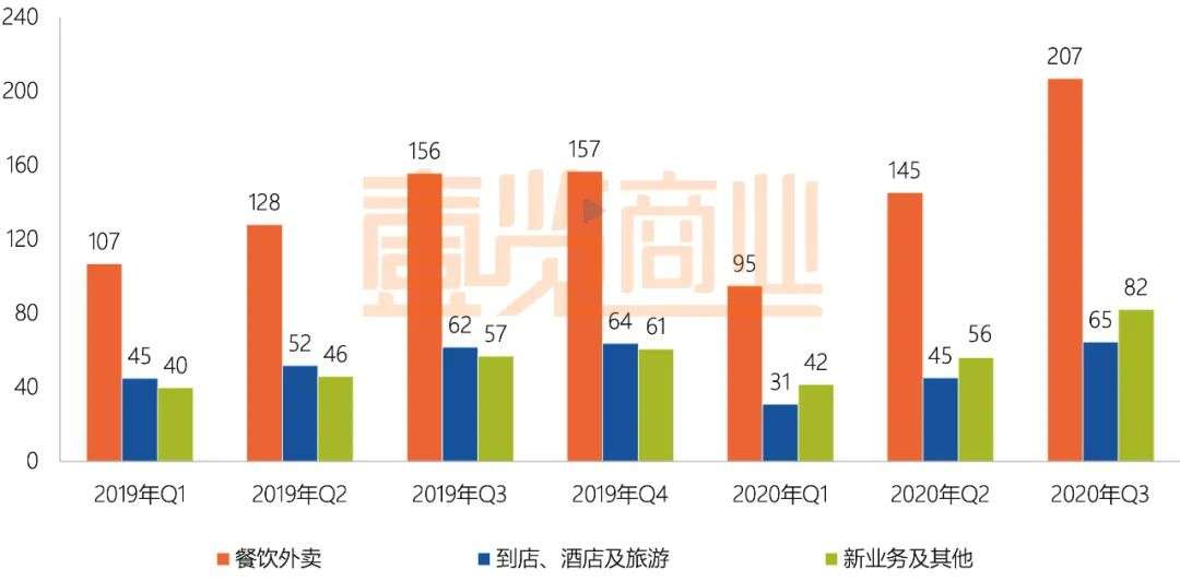 众所周知支撑美团业务的三驾马车分别是:餐饮外卖、酒店及旅游和新业务。据《壹览商业》统计,美团餐饮外卖收入在美团整体业务收入的占比一直超过50%,且有占比越来越高趋势。如2019年Q1,餐饮外卖收入占美团收入55.7%,到2020年Q3这个占比已经提升到58.4%。从业务结构上来看,餐饮外卖已经成为美团业务收入增长的主力。
