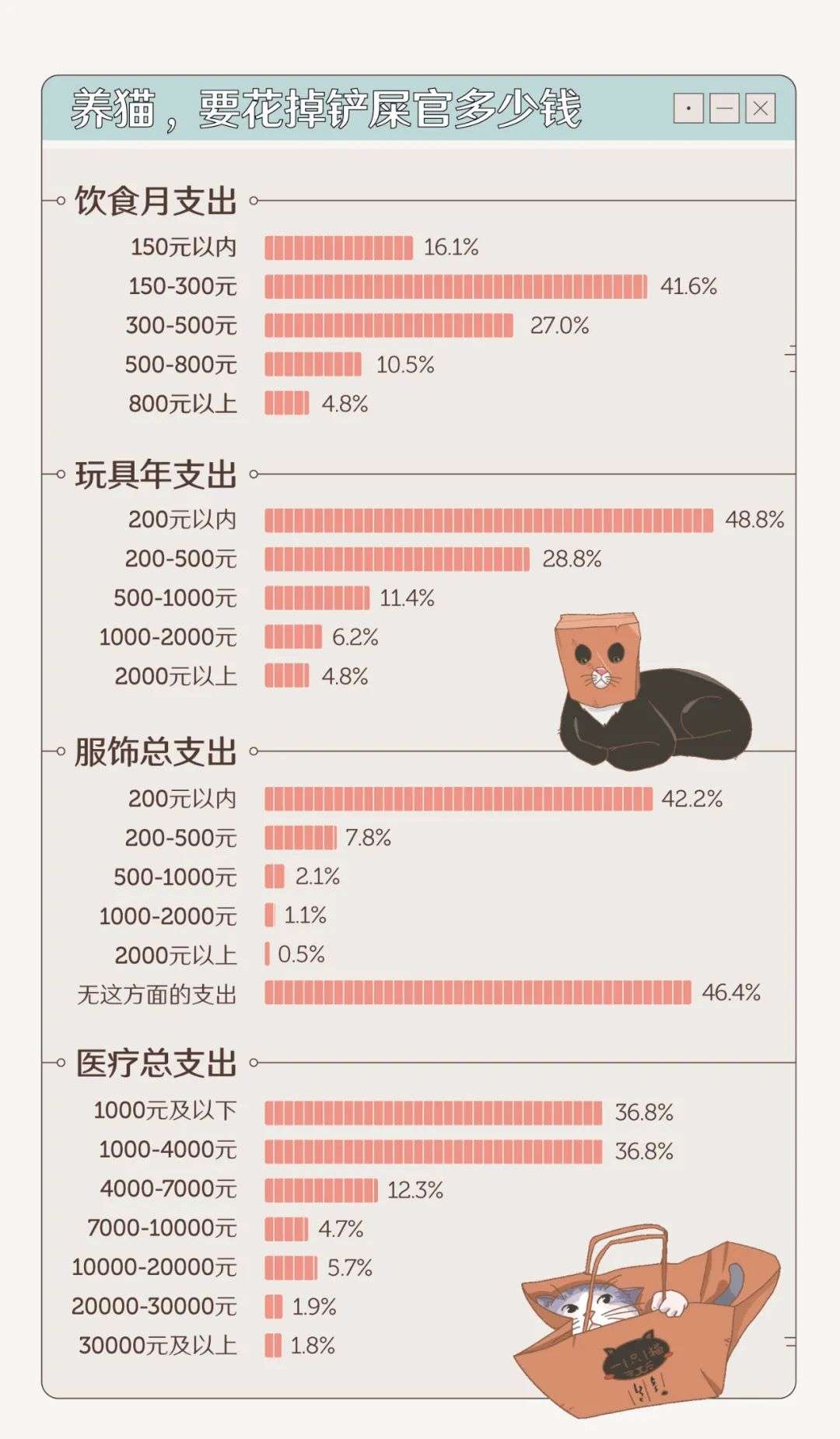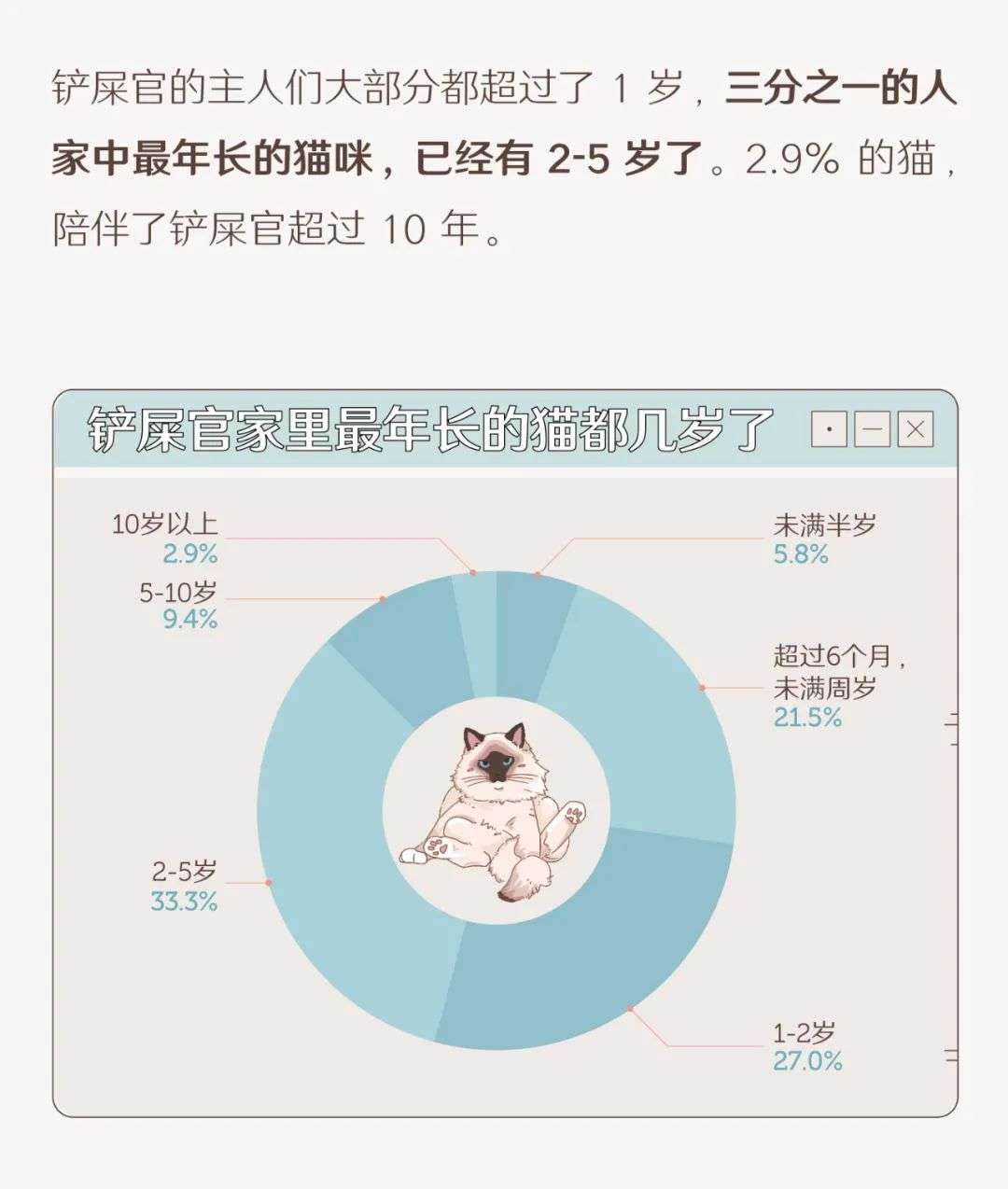 在回收的有效样本数据中,90% 以上的受访者介于 18 到 40 岁之间;处于本科及研究生以上学历的受访者占到 85% 以上;89.8% 的养猫人士为学生或上班族。