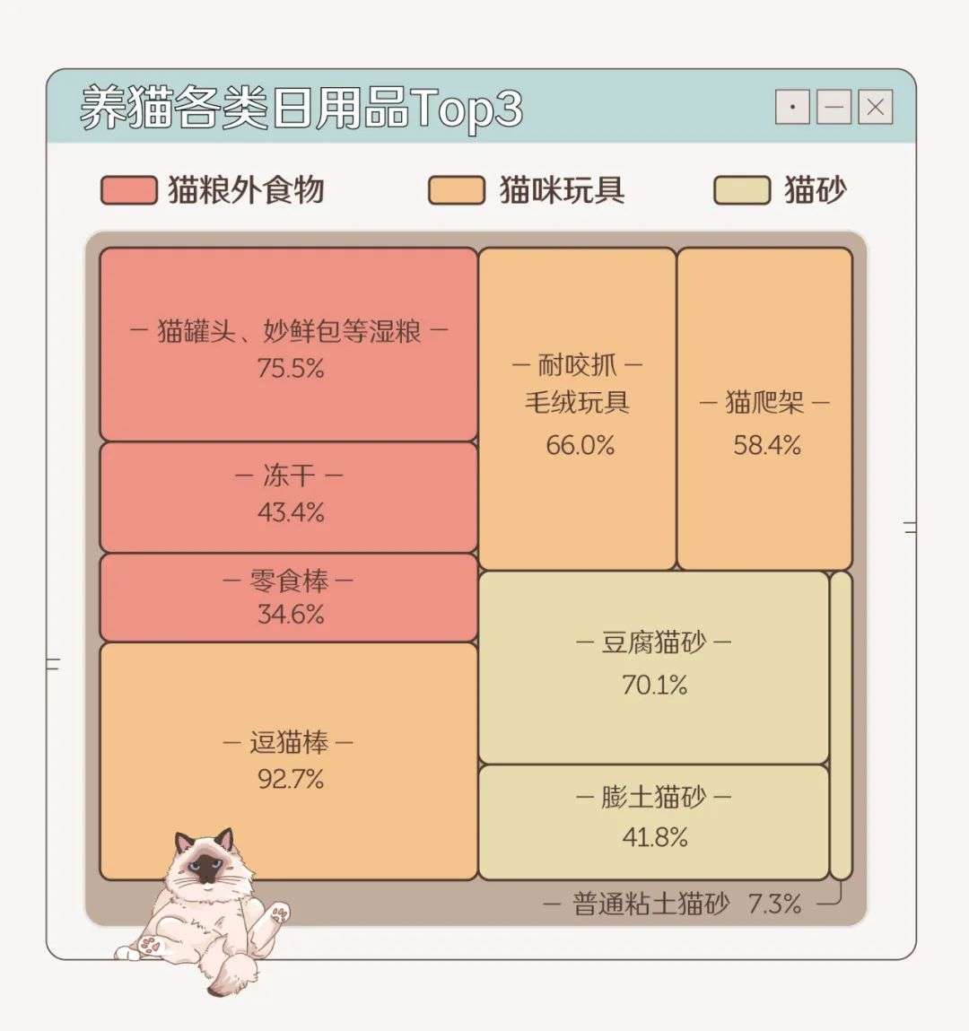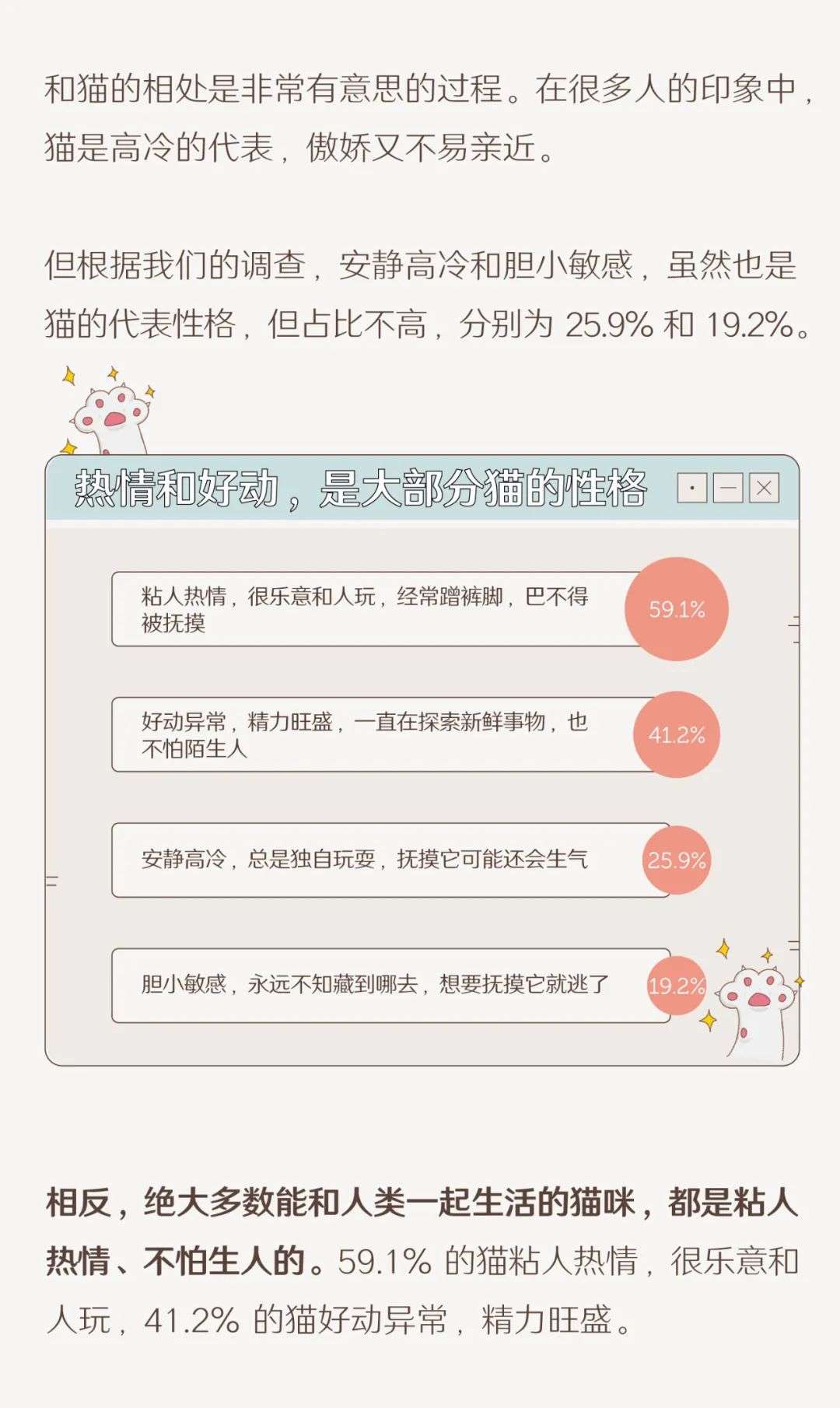 3、将近六成的猫性格热情粘人,安静高冷的猫占比仅为 25.9%。
