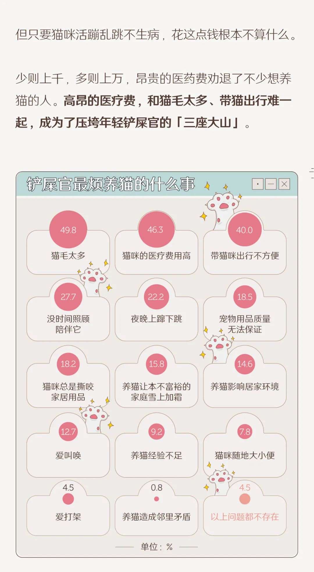 7、猫毛多、治病贵、带猫出门难,是困扰铲屎官的三大难题。