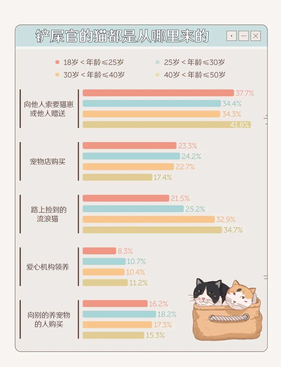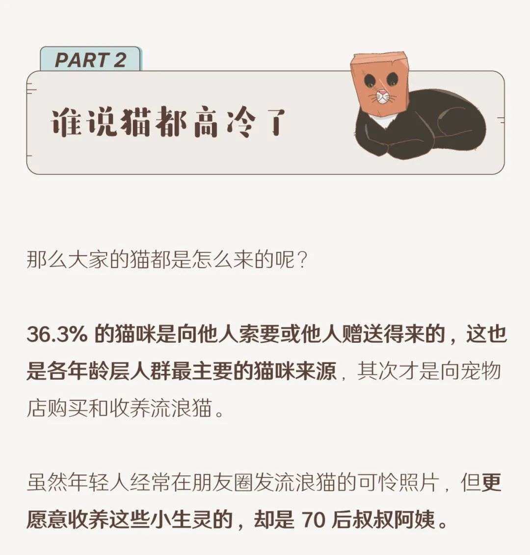 2、收养流浪猫是宠物猫的第二大来源,但 70 后、80 后更愿意收养它们。