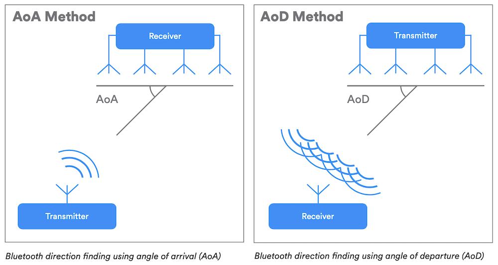 ▲两种利用蓝牙测量方位的方法,都需要多根天线实现