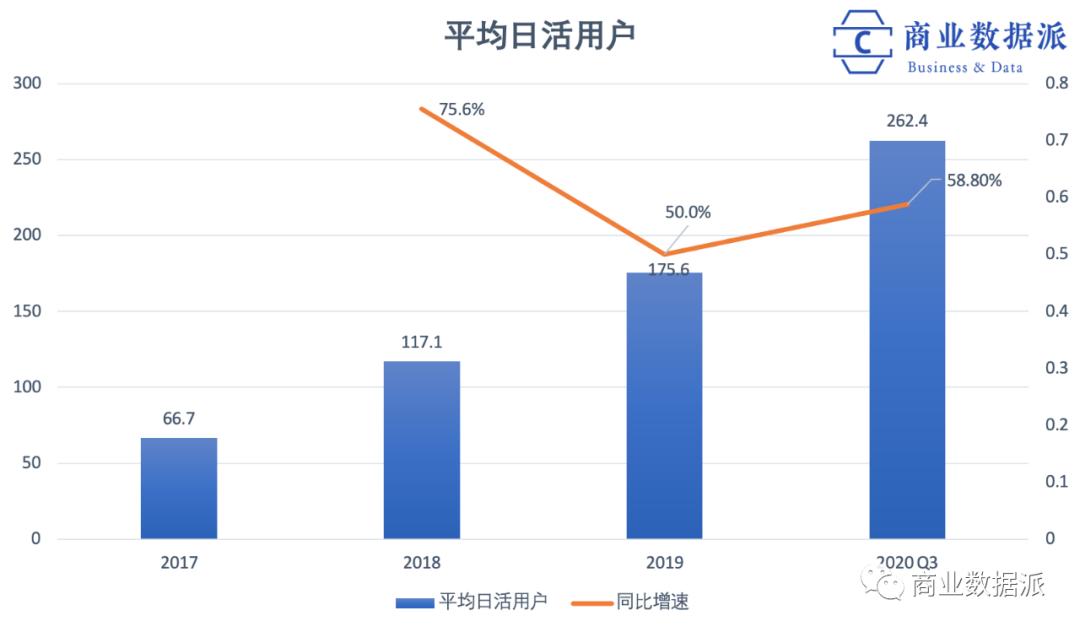另外一方面,快手用户增长也面临承压,截止2020年9月30日中国应用程序及小程序的平均日活用户(DAU)为3.05亿,其中快手APP的DAU为2.62亿。而其用户同比增长率从2018年75.6%逐渐降低至2019年的50%,2020年进一步提升至58.80%。