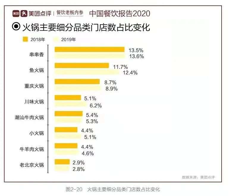 >2018年,串串香仍保持着高速发展,在全国火锅门店数量中占比达13.5%,继续保持火锅第一大细分类别的地位。