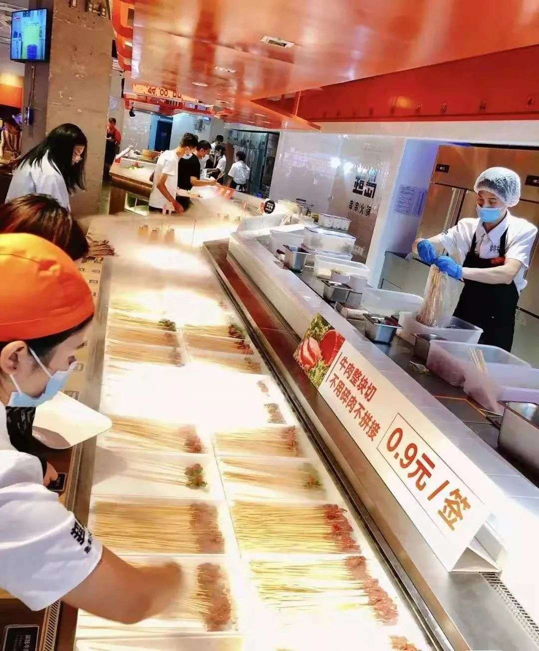 比如丰科万达广场店,14米长的菜品自选展台叫人印象深刻;员工在展台对侧现场穿串,明档操作。