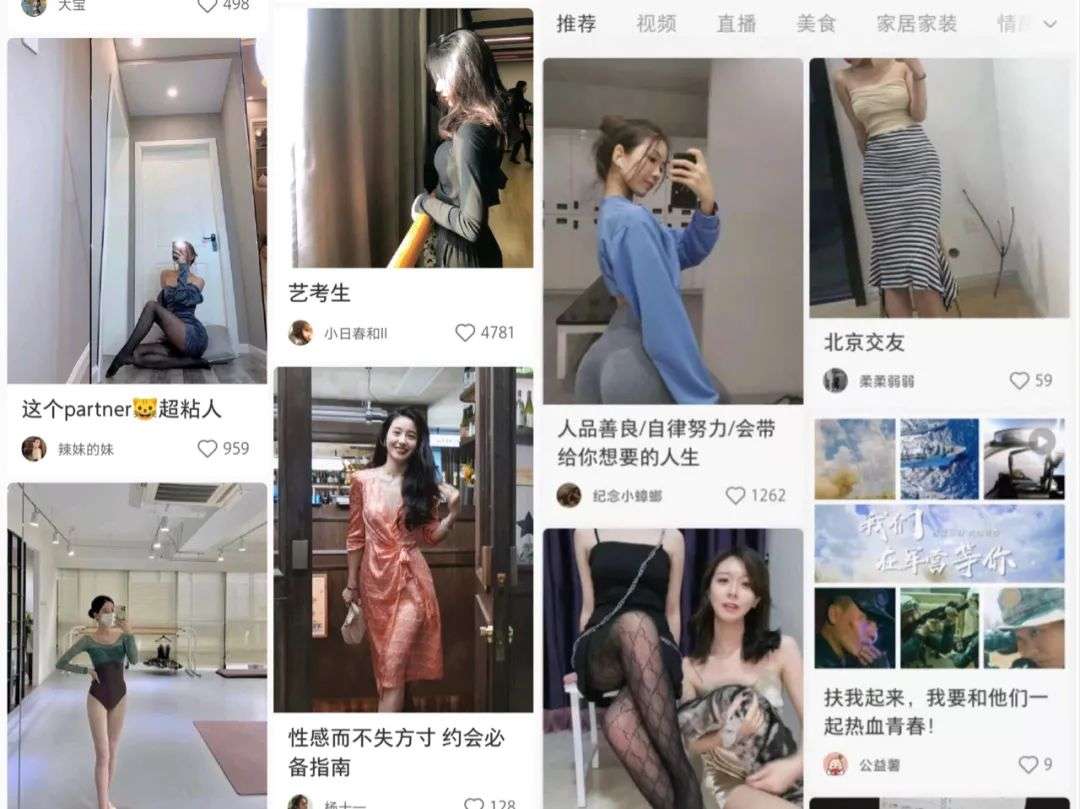 而年轻女性的小红书首页多是时尚美妆、美食等等,很少能看到这种暗示性或是交友的笔记内容。