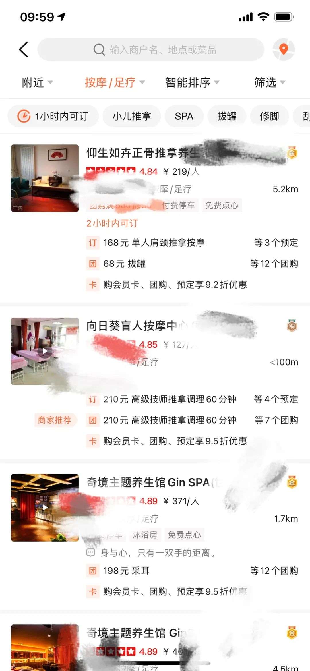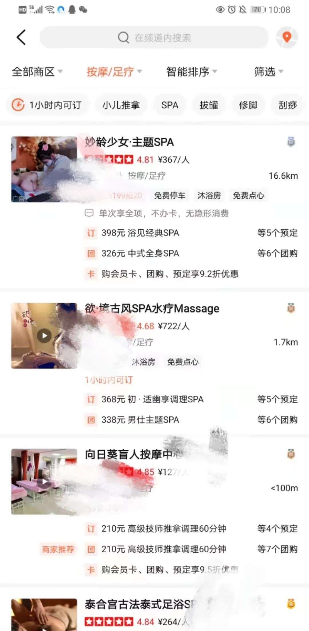 先从大众点评开始,这五部手机的相关信息分别为中年男性、年轻女性和未注册的新用户。在大众点评中点击按摩/足疗页面,定位为附近,两个中年男性的手机显示的为: