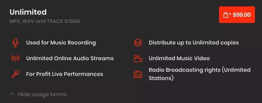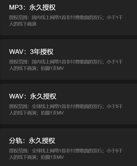 若想要购买中意的Beat,有六种授权方式可供选择:免费不可商用、MP3永久授权、WAV三年授权、WAV永久授权、分轨永久授权和分轨独家永久授权。六种授权方式对应的授权范围也有所区别,且售卖价格依次递增,购买后将自动发送Beat文件和相应的授权合同。