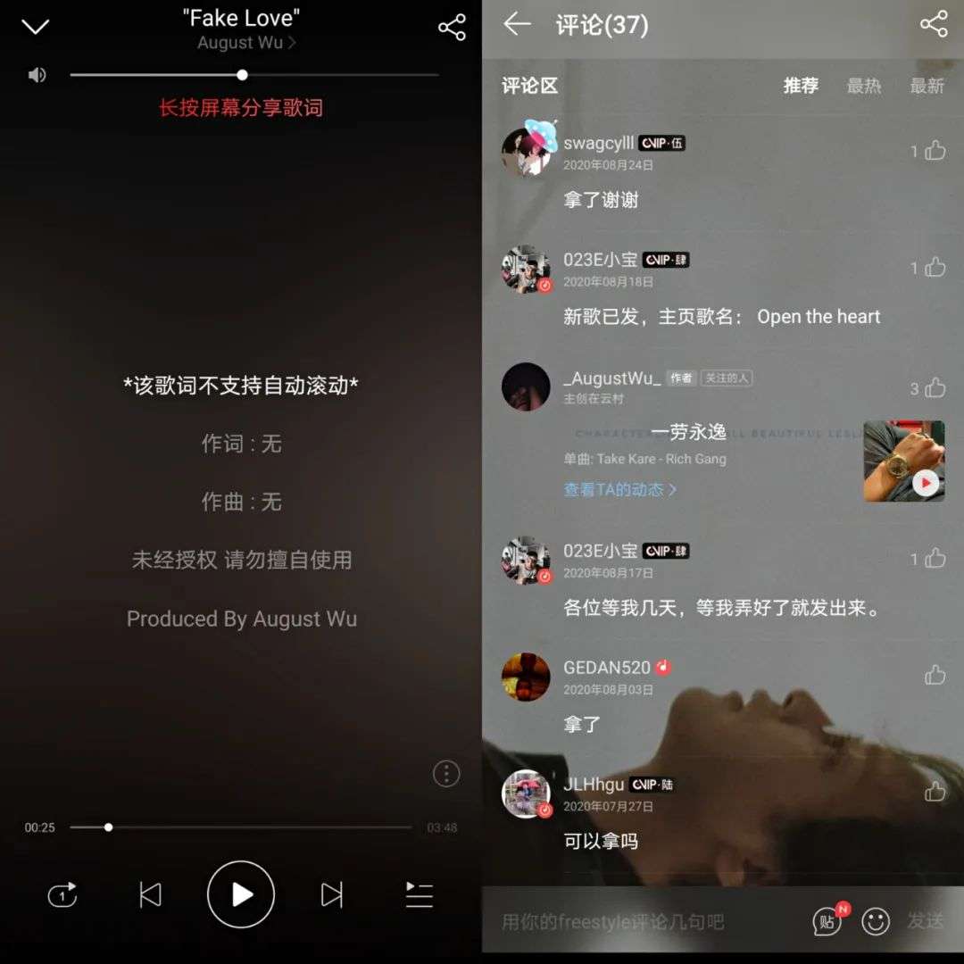 最后,由于网易云提供了歌曲下载服务,虽然在法律上不被允许,但依旧存在着大量Beat未经允许被滥用的情况。比如下图这首《Fake love》,歌词栏中明显标注了“未经授权,请勿擅自使用”,依旧有不少评论说“拿了”“已发《XXX》”,构成了明显侵权。