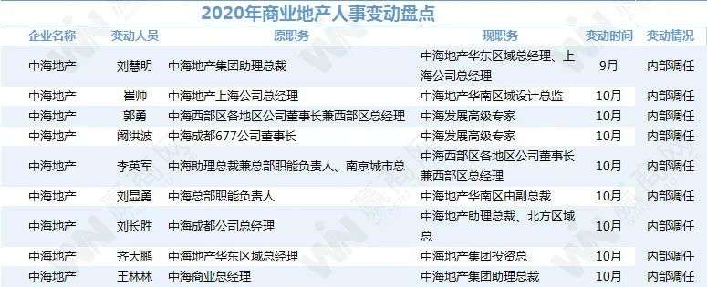 说到“区域人事变动潮”,除了万科,不得不提到中海地产。2020年中海地产出现连续2次大规模的高管轮换。中海内地五大区域,有四大区域接连调换区域一把手: