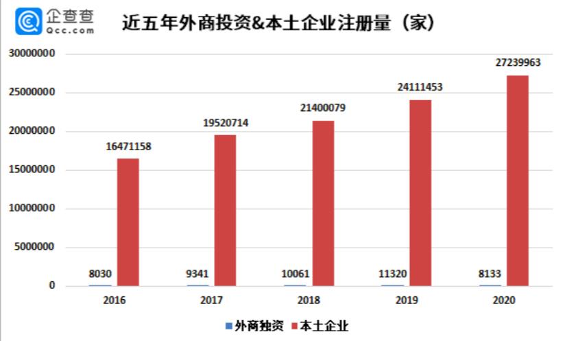 但如今,在很多人看来,外企的时代可能已经过去了。企查查数据显示,2020 年,外商独资企业数量下降了 28.15%,而中国本土企业数量呈逐年上升趋势。