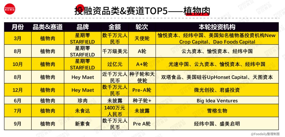 从2020年获得融资的品牌来看,星期零和Hey Maet的表现尤为突出,在过去一年分别拿到3轮和2轮融资,前者更是创下了国内植物肉创业公司融资金额的最高纪录;而经纬创投也成为在该赛道最活跃的投资公司之一。