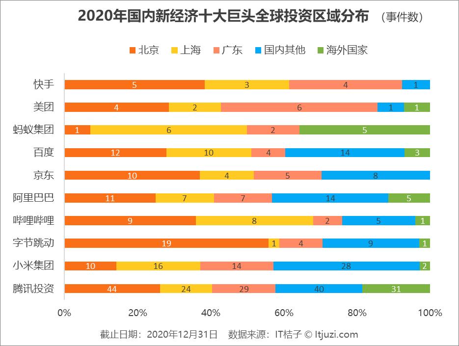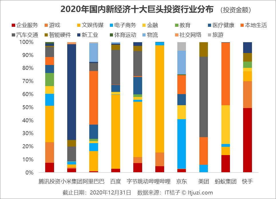 IT 桔子对腾讯、阿里、百度、京东、小米、字节跳动、美团、蚂蚁集团、哔哩哔哩、快手这 10 家在 2020 年最为活跃的巨头进行年度投资数据复盘,分析他们在 2020 年的主要投资方向和策略。