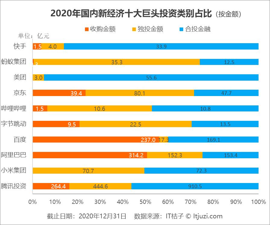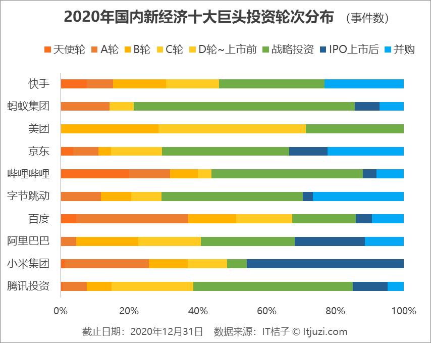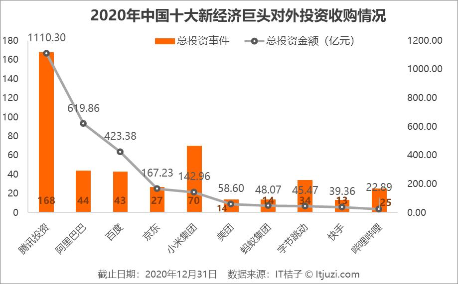 此外,新巨头们也开始活跃,美团 2020 年投资收购 14 次国内外企业,同比增长 75%;快手、哔哩哔哩、字节跳动的投资部也比往年更活跃。