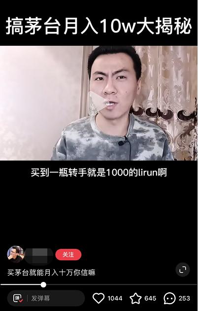 “1499元买到手,市场价2500元,买到以后转手就是1000元的利润啊!”一位博主在某美妆类社交平台上发布了名为《搞茅台月入10w大揭秘》的短视频后,立即收获了一千以上的点赞量。