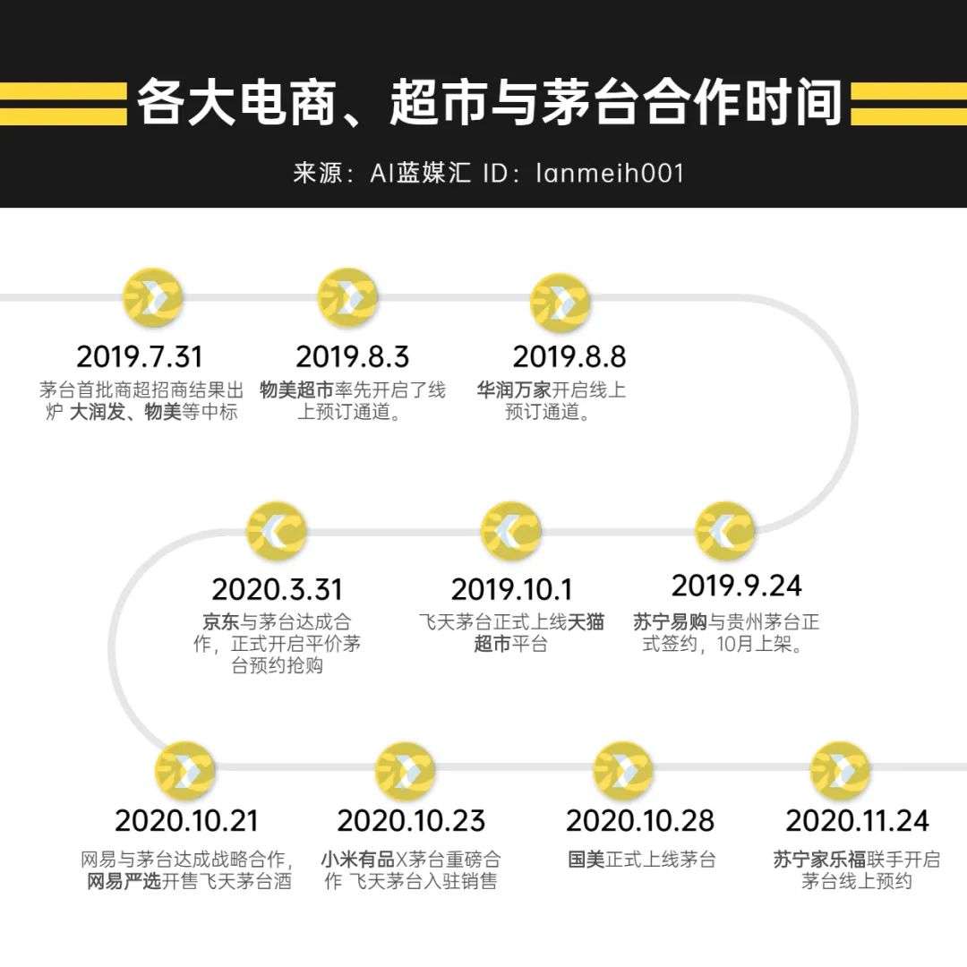 AI蓝媒汇统计,自2019年7月31日,大润发、物美等商超成为茅台首批商超以来,截至目前共有超过10家线上线下商超成为茅台指定销售平台。