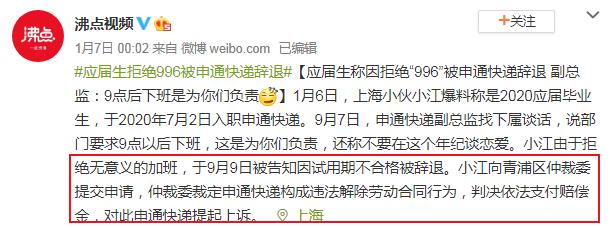 1月初,应届生小江称因拒绝“996”被申通快递辞退,小江向青浦区仲裁委提交申请,仲裁委裁定申通快递构成违法解除劳动合同行为,判决依法支付赔偿金,对此申通快递提起上诉。