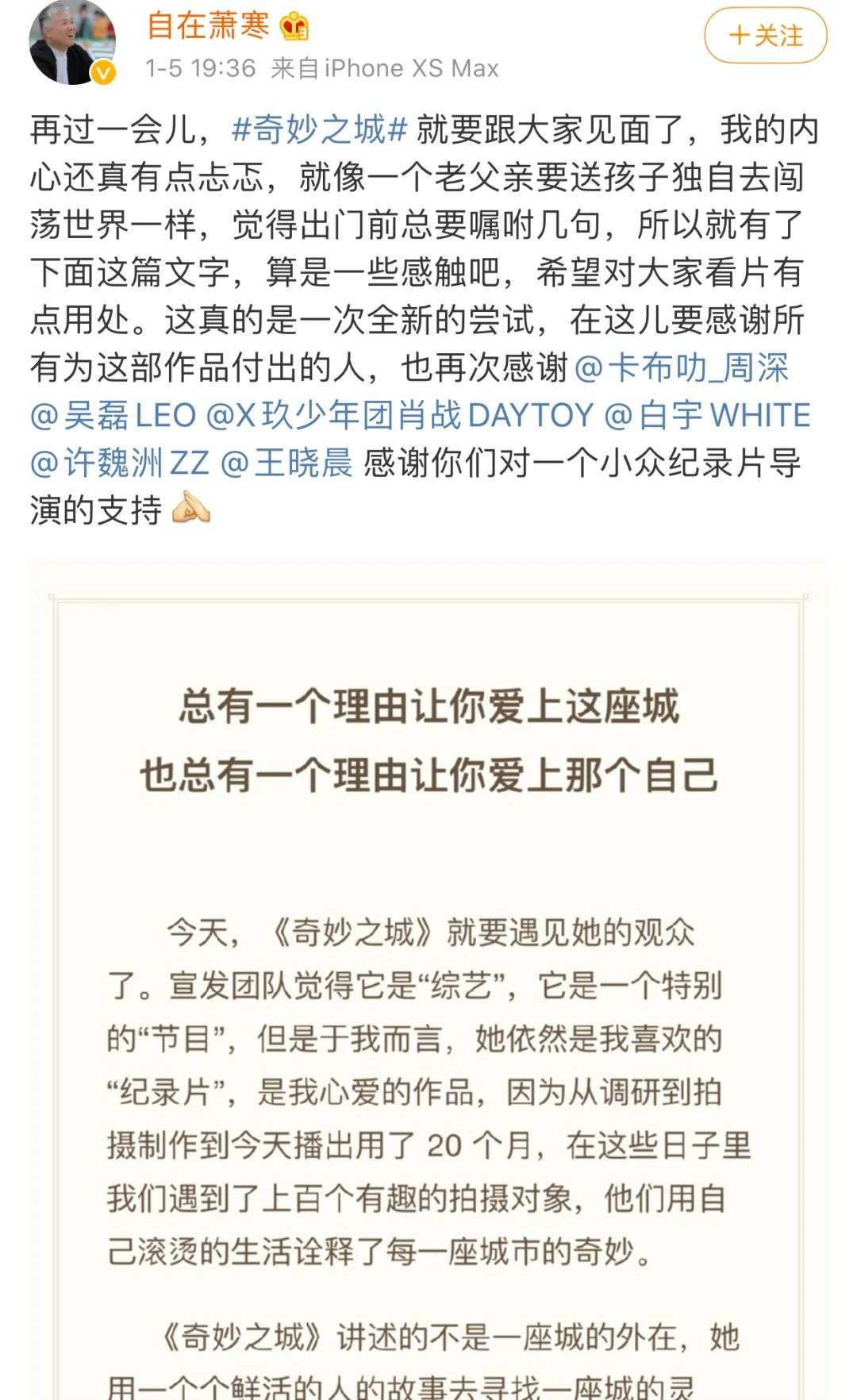 《奇妙之城》开播前,萧寒在微博发布长文,文中提到这个特殊的项目被宣发团队视为“综艺”,而他仍然把它视为“纪录片”。