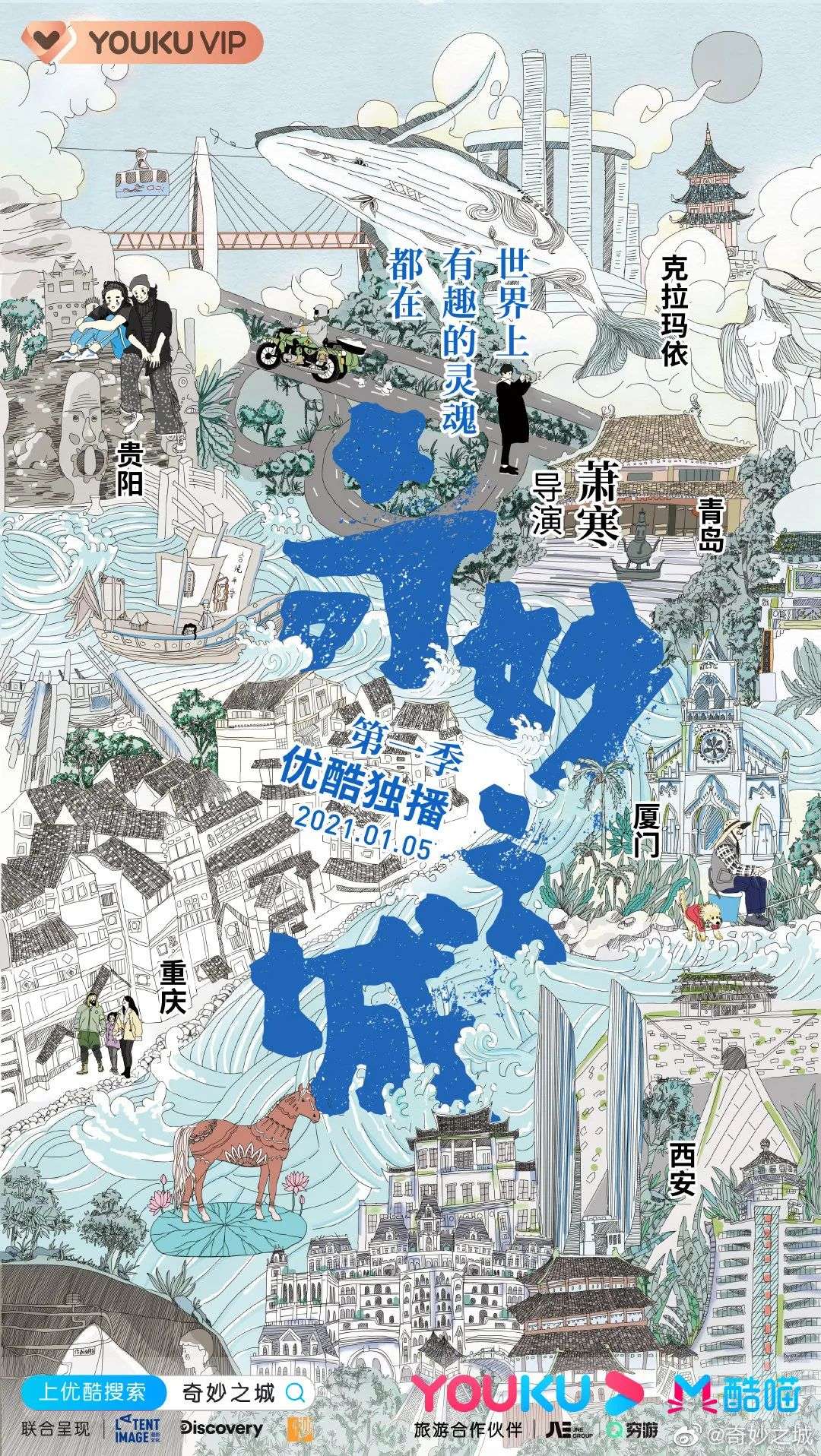 1月5日,城市纪实探索节目《奇妙之城》在优酷开播,至今已播出3期。该片由纪录片导演萧寒执导,主角是一位明星和两位素人,讲述了贵阳、重庆、厦门、西安、克拉玛依和青岛6座城市。