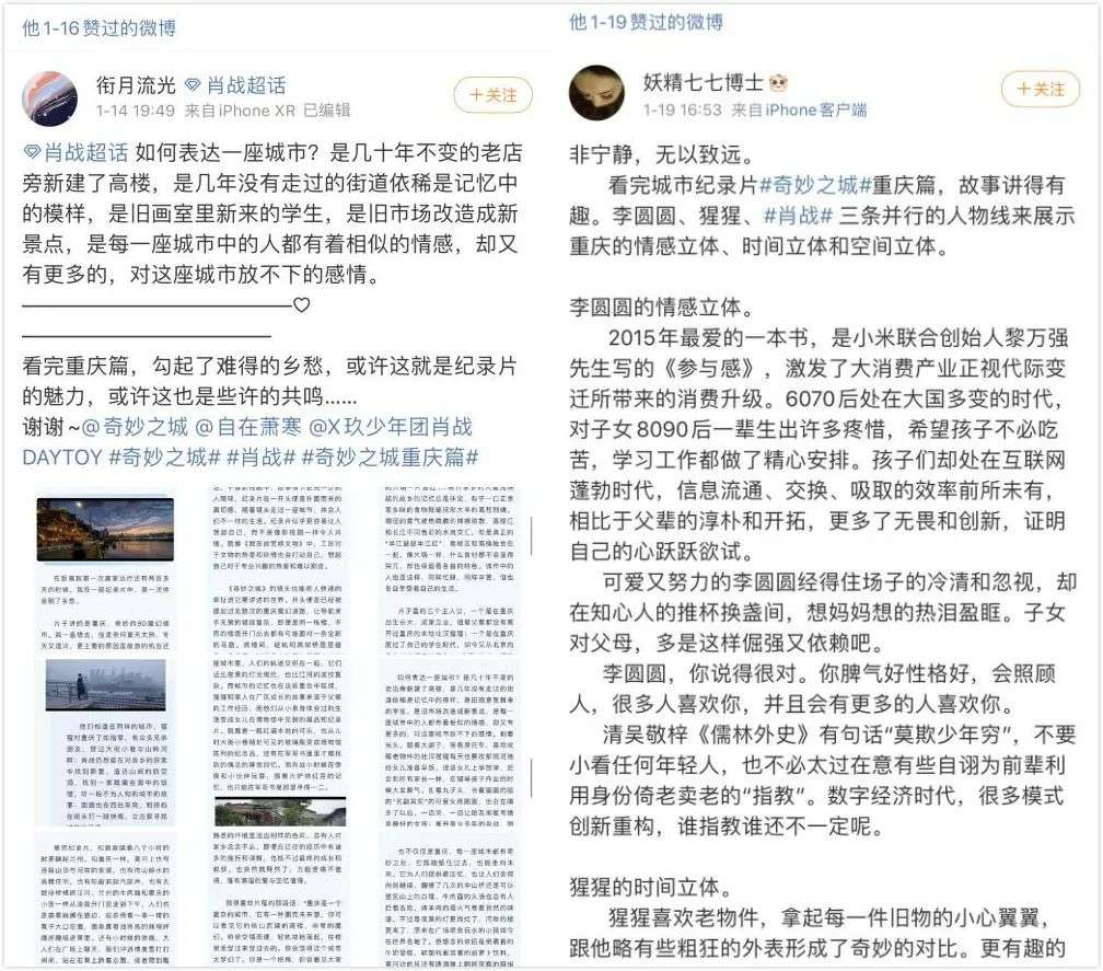 在萧寒和节目组的微博,我们可以看到许多粉丝留言,其中不乏走心的“小作文”,表达了对于节目和所拍城市的感想。