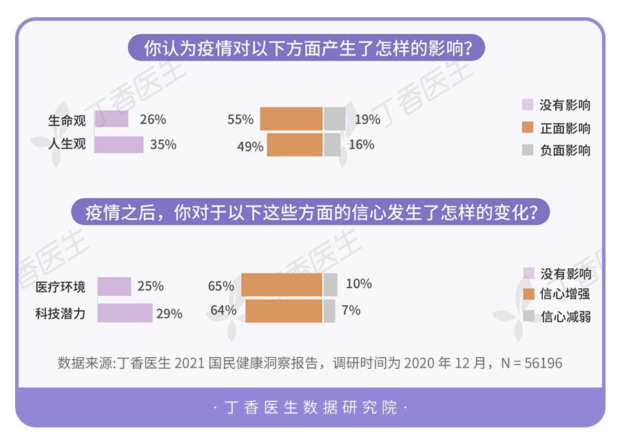 调查显示,74%的人因为疫情改变了生命观,65%的人改变了人生观,其中分别55%和49% 的人认为疫情给自己的生命观、人生观带来了正面的影响。经历疫情之后,65%的人对我国的医疗环境信心增强,64%的人对国家科技潜力的信心增强。