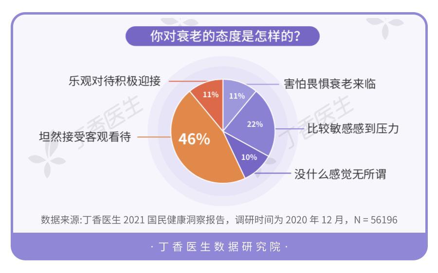 有趣的是,虽然人们给自己设定了一个远远提前于真正衰老年龄的期限,但却对衰老这件事并未感到过于焦虑,仅有33%的人表示敏感或畏惧衰老的来临,57%的人则选择坦然接受,并以乐观的态度积极迎接,并且年龄越大,对于衰老的态度越坦然。