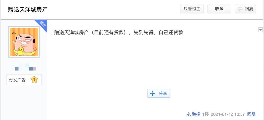 在某社交平台,有名叫“厚土”的网友发帖表示,“赠送(燕郊)天洋城房产(目前还有贷款),先到先得,自己还贷款”。