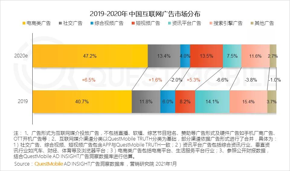 另一头,2020年国内在线广告市场保住了两位数的年增速,短视频抢走了广告风头,其13.5%的占比已经跻身在线广告所有类别中的第二名,仅次于电商广告(下图QuestMobile数据)。池子够大,但竞争也非常激烈。短视频平台主要是看效果广告,效果=展示量*点击率*转化率,广告主根据效果投放,效果越好,广告主为每千次展示的出价就越高,反映到平台每千次展示收入eCPM也越高。为了广告这个盘子,快手需要吸引更多人进去,并改进推荐算法的精准度。