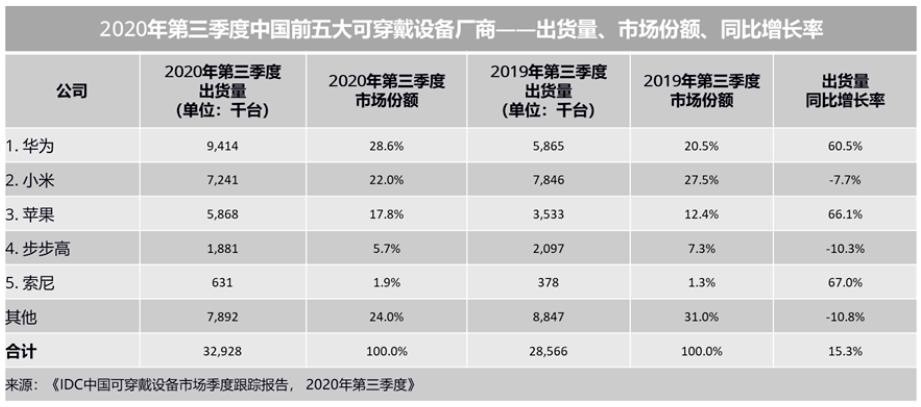 2020Q3中国可穿戴设备市场份额,图源IDC中国