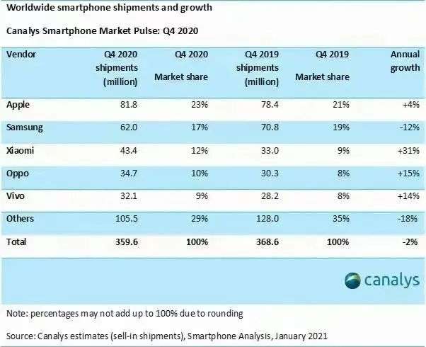Canalys 2020Q4手机市场份额占比,图源Canalys官网