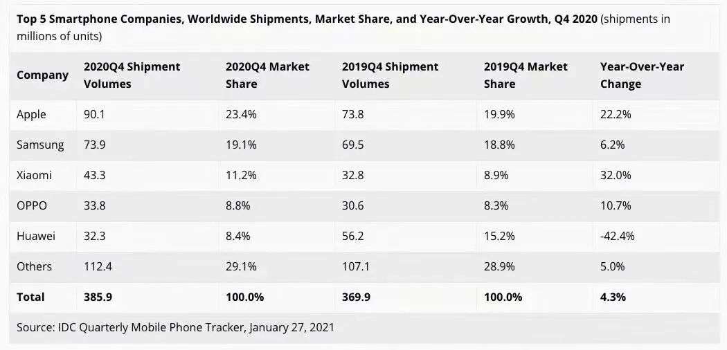 IDC 2020Q4手机市场份额占比,图源IDC官网