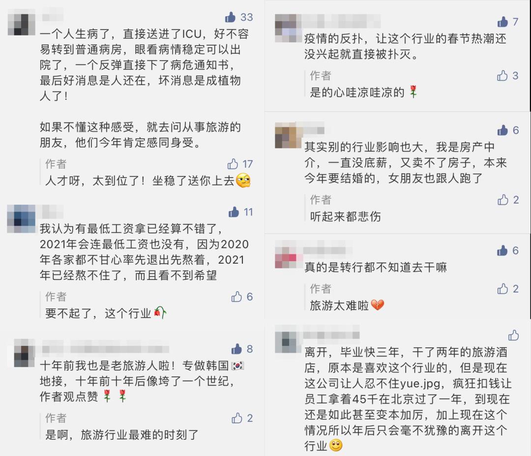 闻旅之前发布的《2020旅行社人间真实:不谈业绩,只论生死,我只配拿最低工资》(点击蓝字即可查看)文章中的留言虽然简短,但面对2021年看不清的行业现状,纠结留下还是继续的从业者也有不少。
