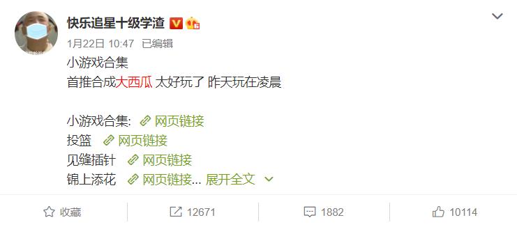 1月21日起,@橘子娱乐、@齐齐哈尔市倪萍、@异能八卦局长娱乐博主、@快乐追星十级学渣等多个微博娱乐大V、营销号都陆续发布小游戏安利合集,并首推《合成大西瓜》。